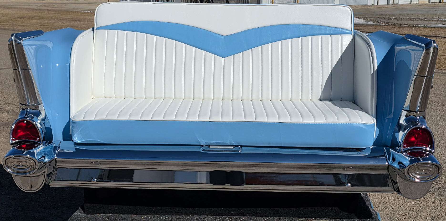 COOL PROJECT SALE: These twin classic 1957 Chevy Bel Air Rear End Couches were made for the Hard Rock Hotel located in Daytona Beach, FL. We can build one of these for you in about 8-10 weeks. The chrome work is perfect and we can paint one in the color of your choice. These couches have optional Power/USB Hubs on each side (add $150) This can be yours for only $8,810.00 USD EA plus $300 for crating plus shipping costs. Please call us today to order one of these couches for your own.Call (478) 320-2502 today. |